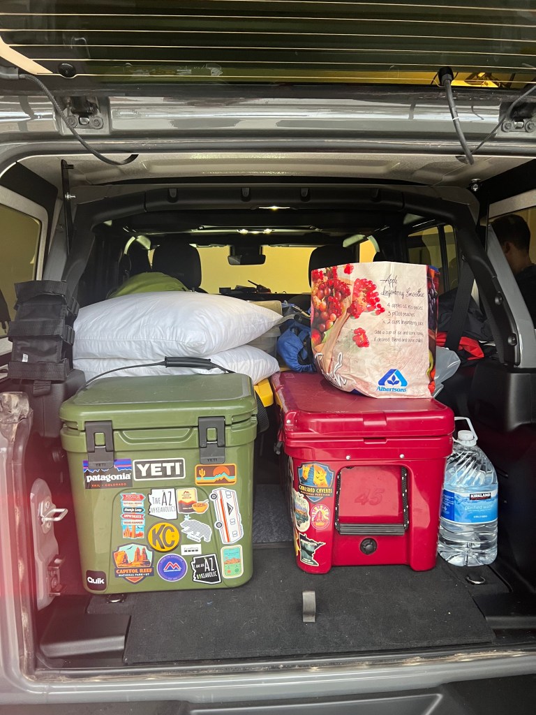Our goal is to pre-pack as much as possible, so during the week we are putting our bags together and gathering the gear we want. Then on Friday before or after work we’ll pack the car so we can get on the road quickly depending on when we plan to leave. For day hikes, we often fill our water reservoirs the night before and leave them in the fridge so we have cold water the next day. We will make sure our snacks are packed and any additional gear is in our bag or ready to be packed.