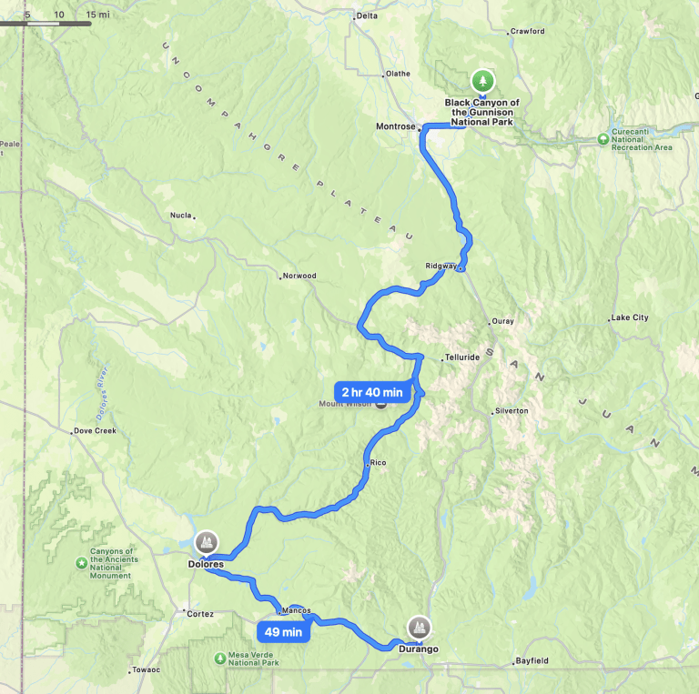 Unfortunately, we weren’t really paying attention to our maps and went to Durango thinking we could stop for more coffee creamer on our way to the National Park. We then got more coffee and a better breakfast before heading out. However, only after stopping and then starting our maps again did we realize that a portion of the highway we wanted to take, the Million Dollar Highway (US Route 550) was closed for a bike race until around 1pm. So instead of waiting in traffic for the road to open up, we decided to take the back way through Dolores, CO and past Telluride. In hindsight we’re happy we saw the closure before getting to it. And the route that we did take was stunningly gorgeous. Turns out, its part of the San Juan Scenic Byway.