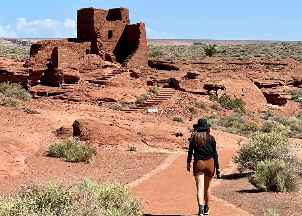 At the final stop, closest to US-89 (4 miles away) is Lomaki Pueblo and Box Canyon Dwellings. It’s about 0.64 miles out and back to Lomaki. Along the way you’ll see the Box Canyon Dwellings that look like they’re sitting in front of Humphrey’s Peak. Lomaki also has a great view of the San Francisco peaks and multiple rooms still standing! Please do not climb on or carve into pueblo walls, and remember to respect these ancestral homes that are still culturally significant.
