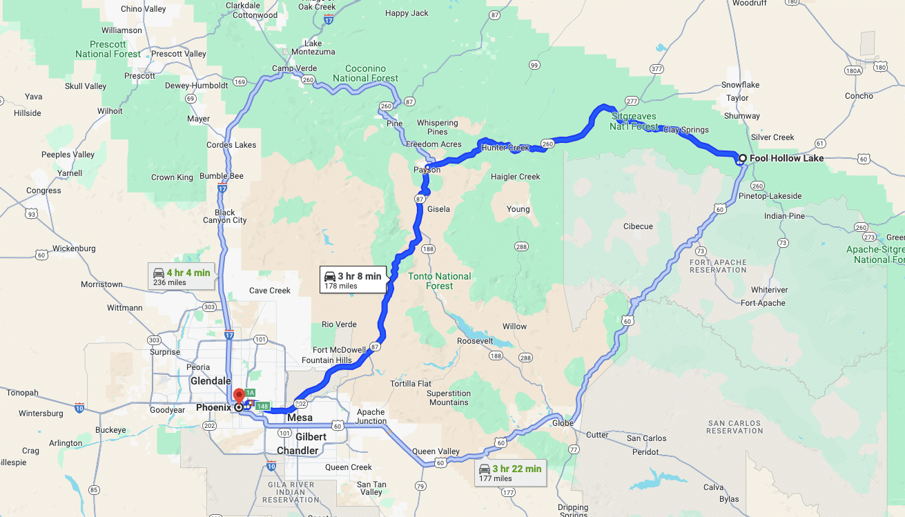 Fool Hollow Lake Recreation Area is located in Show Low, Arizona in the White Mountain region on the eastern edge of the state, and is managed by Arizona State Parks. The lake sits at 6,300 ft in elevation and is popular for its cooler temperatures, fishing, and camping. From the Phoenix area, the lake is about 2.5 to 3 hours northeast and from Tucson the drive is about 3 hours and 45 minutes long. The park is close to gas stations and grocery stores in Show Low. We went into town to buy firewood and some food items we forgot! Fool Hollow Lake Recreation Area has multple easy trails along the lake’s shore, designated fishing spots with shelters, multiple boat ramps, picnic ramadas with grills, and a playground.