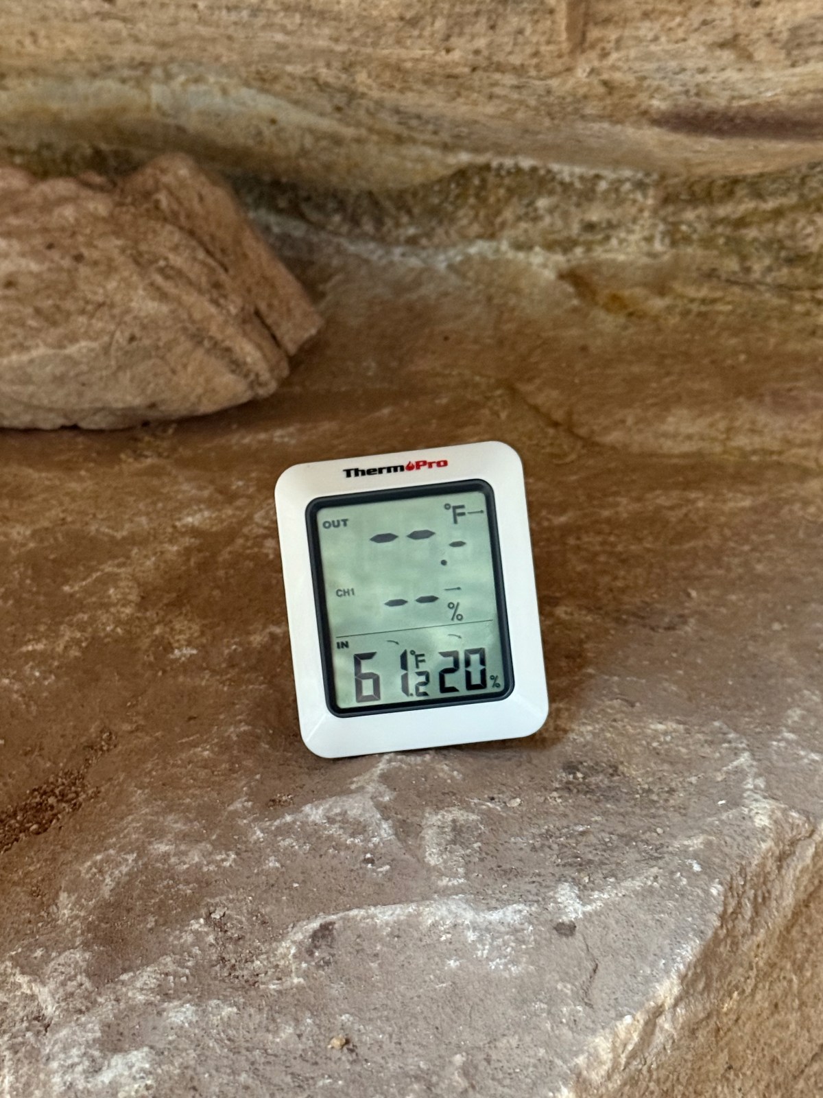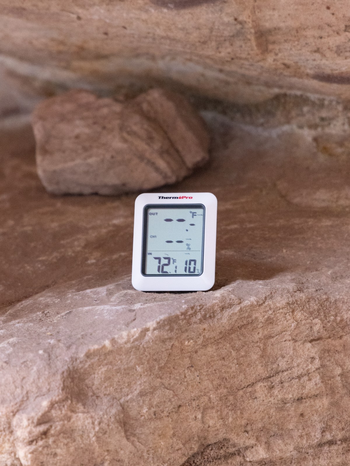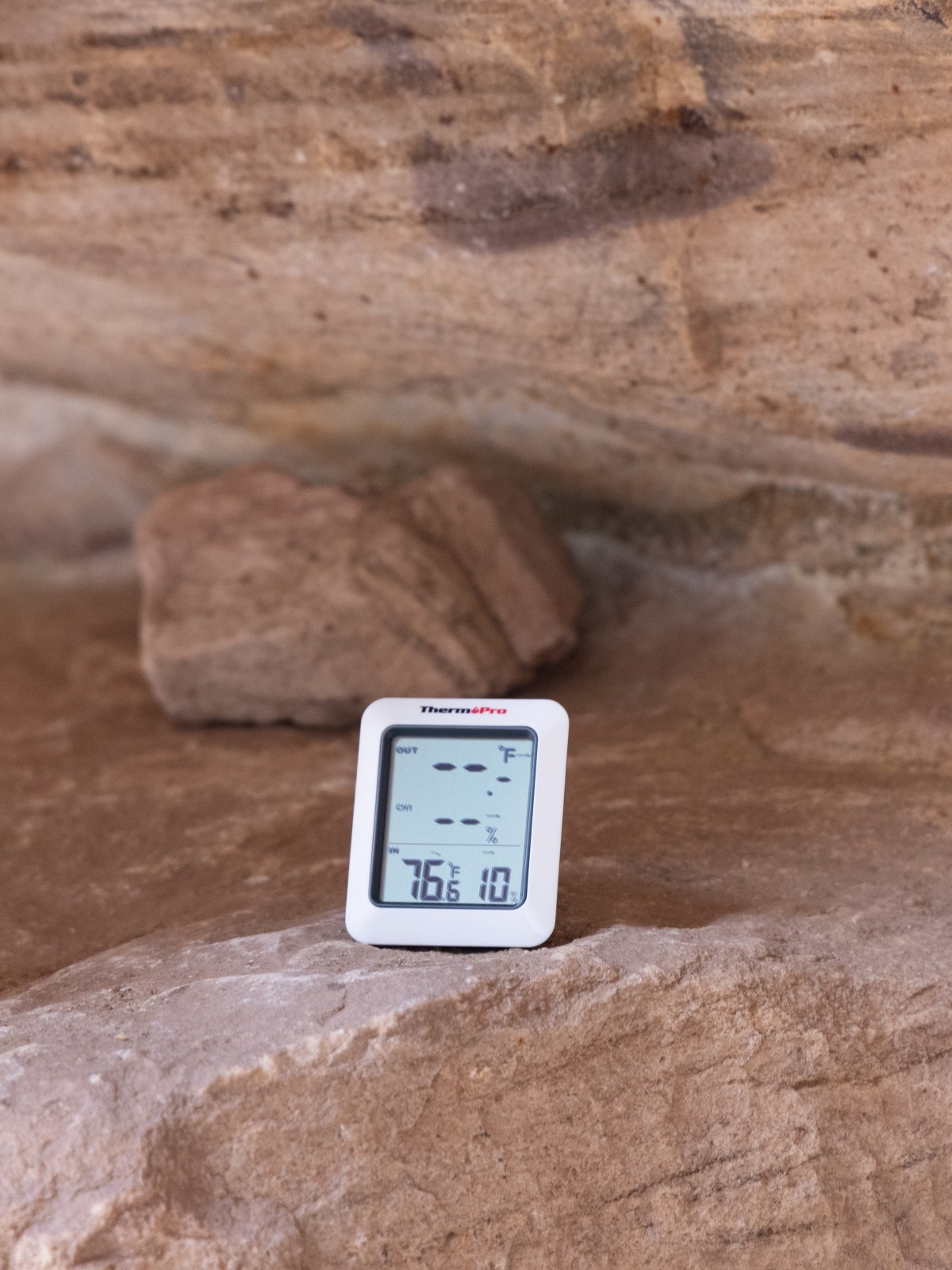 There was some uncertainty going into our trip about how much the wind would impact us. Above the rim it was breezy the morning we started, adding some extra windchill. We were hoping the position of the Hermit Creek campground within the canyon would provide a natural shield from the wind. Generally, the the more open spaces within the canyon, like a the river, are windier. Luckily, we were protected from the wind and gusts would come through, but nothing consistent. Based on the Phantom Ranch forecast we were expecting highs in low to mid 70s and lows in the upper 40s to low 50s. We brought a digital thermometer to get an accurate reading of the temps at camp. We had a spot against the canyon wall with a ledge overhanging us. It helped provide more wind protection, extra shade, and retained some warmth.