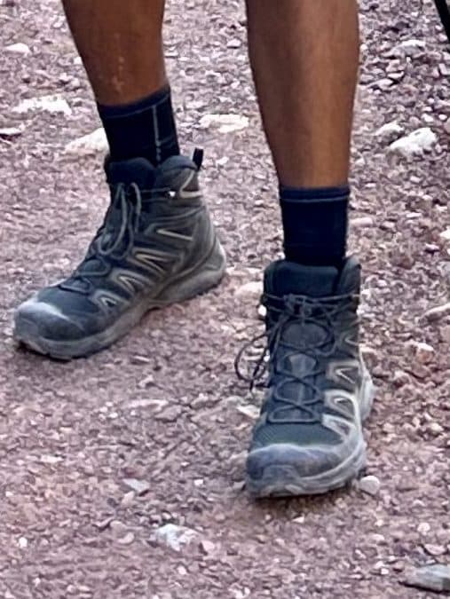 Owen wore Salomon X Ultra Mid 4 hiking boots because he knew they are comfortable and he wanted the ankle support. Today, these are the latest version available from Salomon.