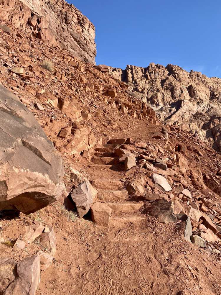 As you get higher on the trail the sheer steepness of the cliff sides becomes apparent. If you’re afraid of heights, don’t look down! The trail is fairly easy to follow, if you go off trail, you’ll most likely go off the side of the cliff. However, as you continue up the switchbacks there is an increasing amount of sand from rock erosion on the trail. The sand does make traction difficult as it sits on top of large rocks that form the corners of the switchbacks. So as you step on the rocks and your foot slips a little with the view of impending death below, GO SLOW! Sometimes there is a series of steps built out of the rocks with a layer of sand covering them.