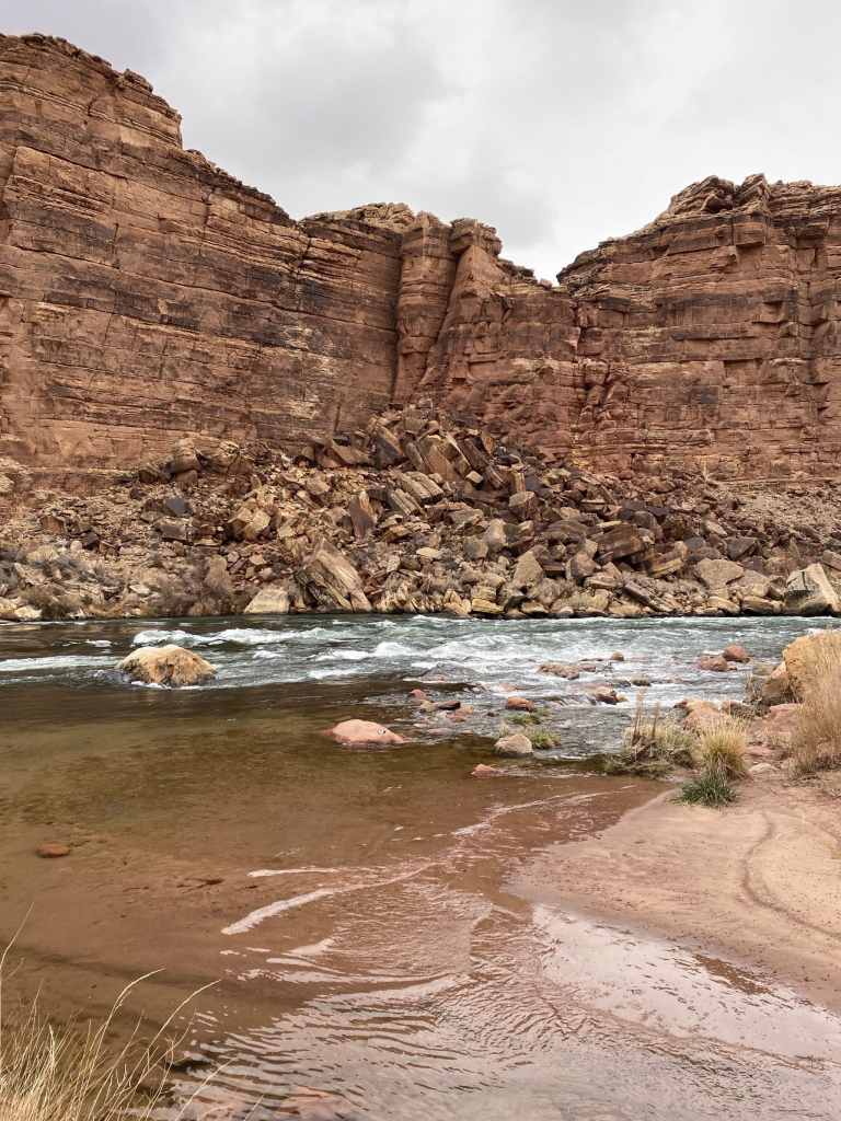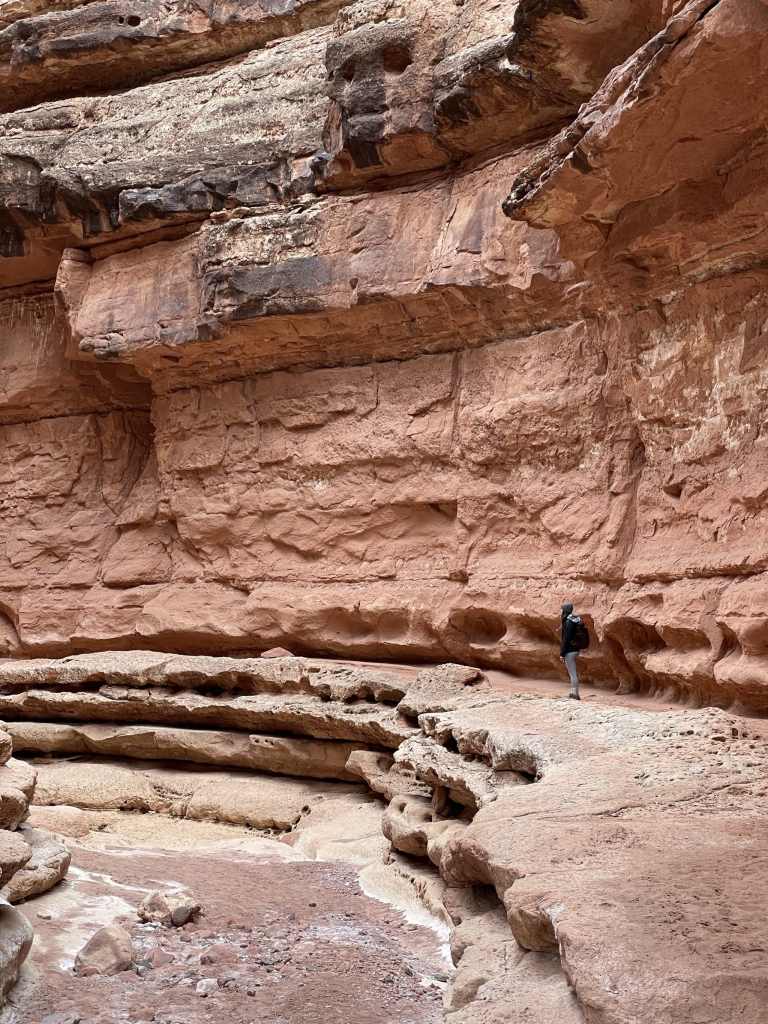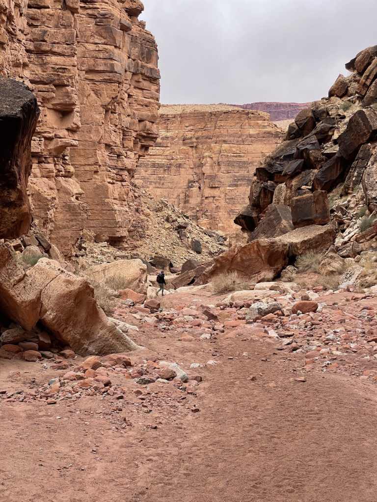 There is one major drop off that looks intimidating at first, but after reading the description, it wasn’t too difficult. There is a spot where you can slowly descend down to the rock layer below, and then you duck under a “tunnel” to continue down the trail. For most of the trail, our best advice is to STAY RIGHT. We continued to ask ourselves, can we get back up this way?? Our goal was to come back the way we came. With that being said, there is an important part of the trail where crossing over to the left side is best and easiest. It’s towards the end after you go around this towering bend in the wash seen in the photo below. After crossing over you’ll stay left until the wash starts to open up. At this point you’re very close to the Colorado River and should be able to hear the rapids.