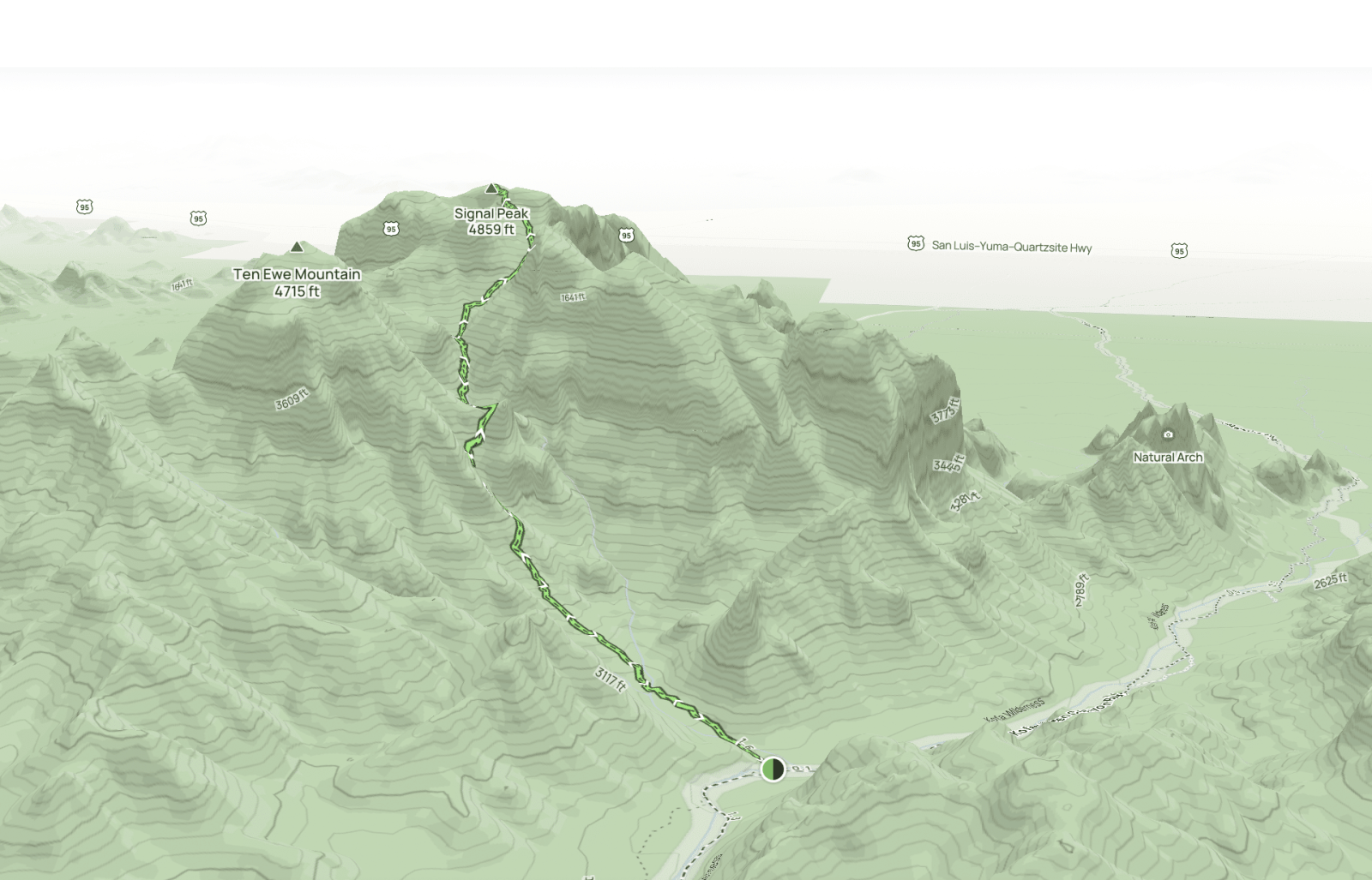The hike to Signal Peak in Kofa NWR is very challenging and we recommend this trail only be attempted by experienced hikers, and those without a fear of heights. Although only 2 miles to the peak from the trailhead, the trail is often quite narrow, quite steep, consists of loose rock scree, and is challenging to navigate. To best navigate the trail look for the worn path, rock cairns, and download the trial to your phone for use without cell service. We use the paid version of AllTrails+.